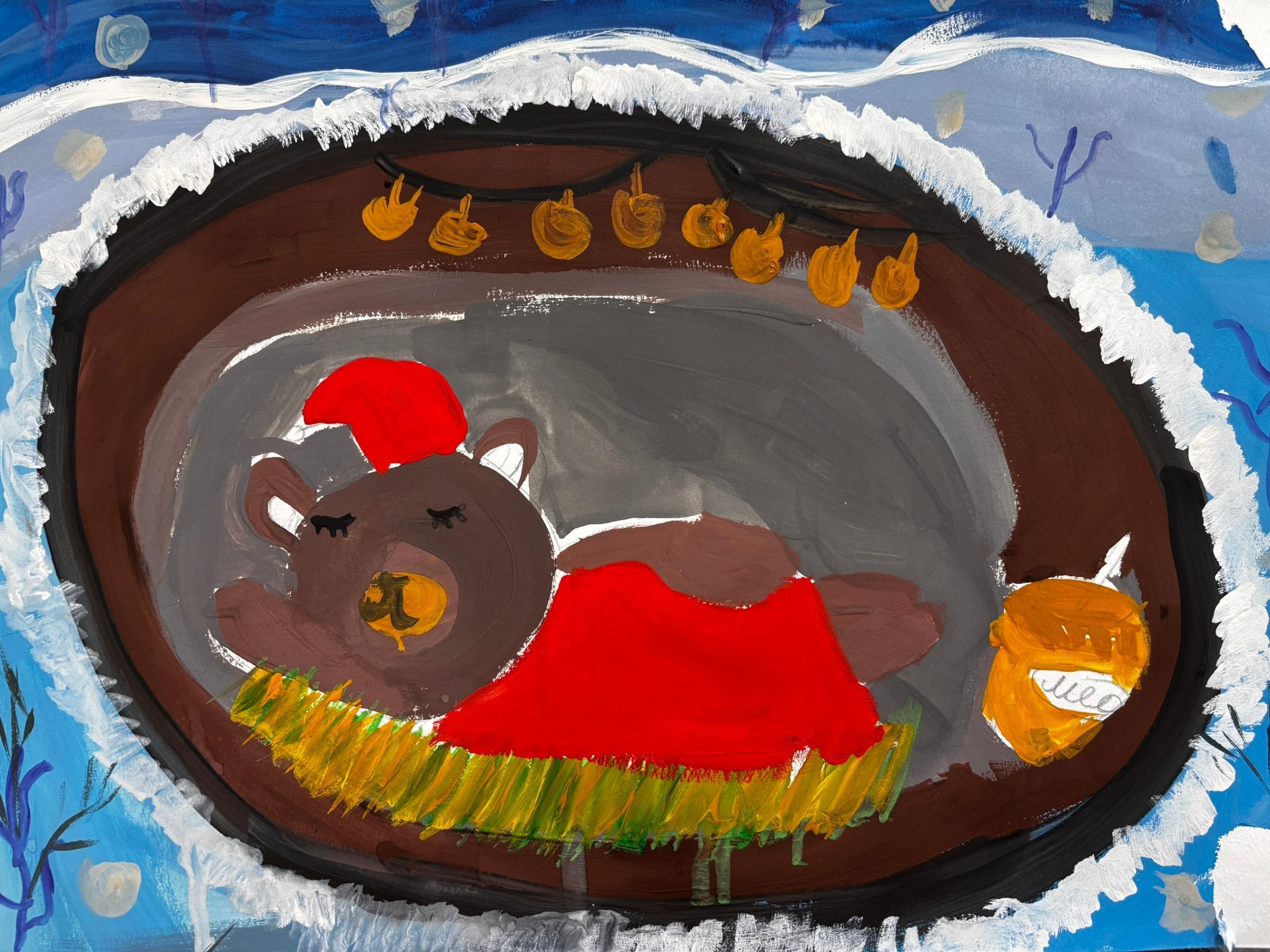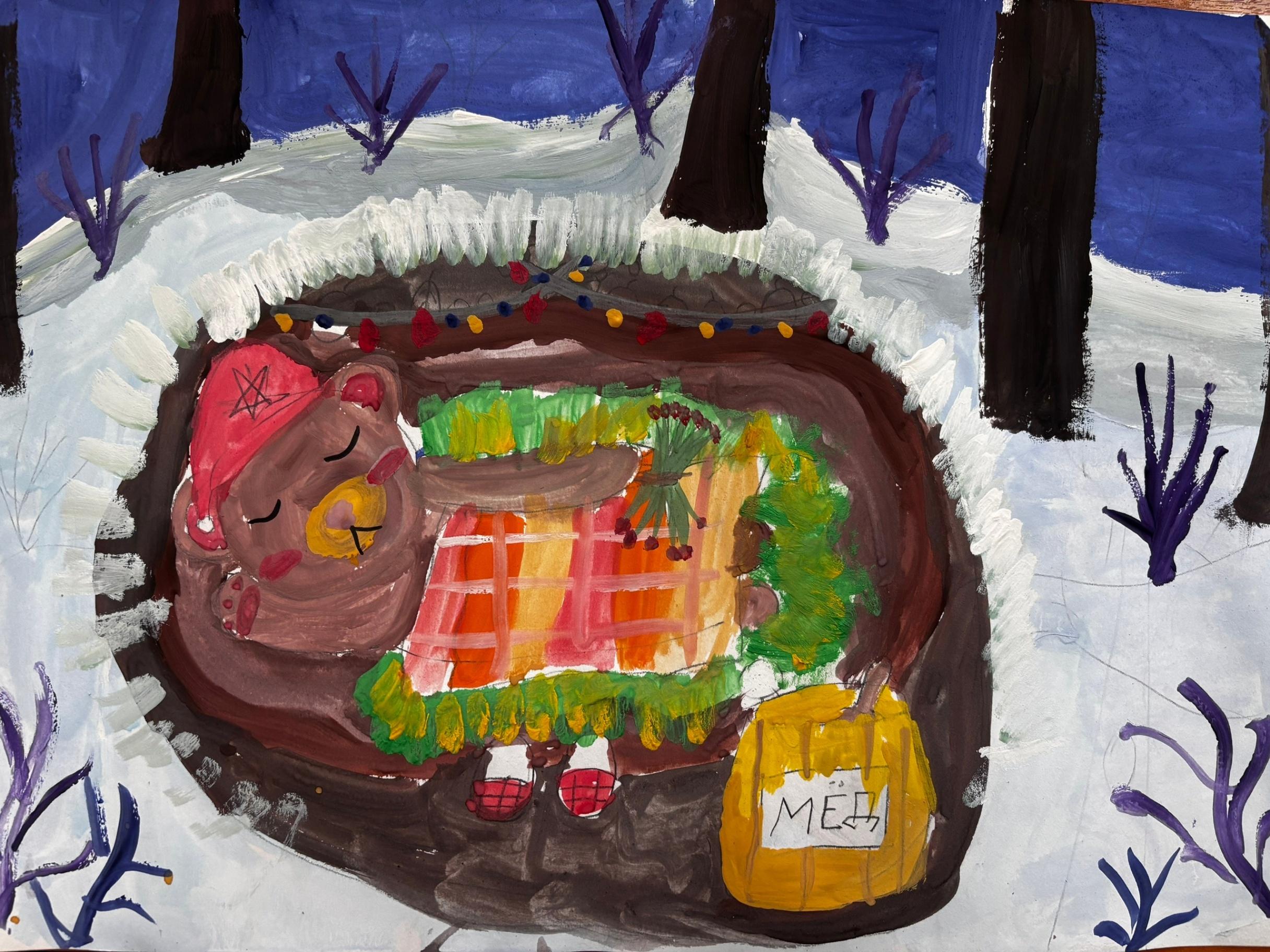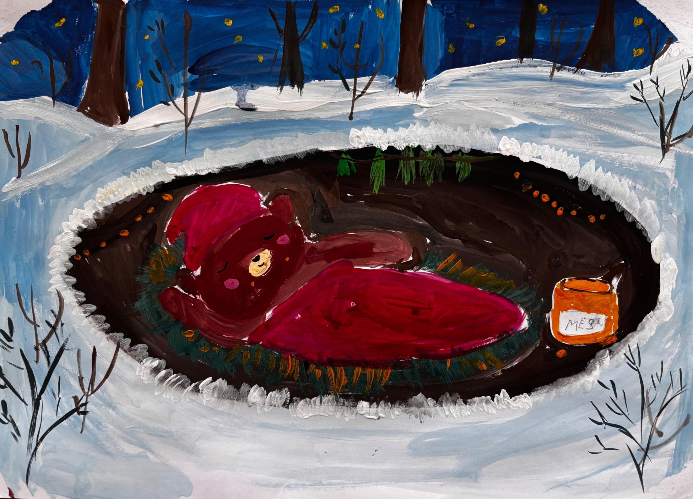 Рядом с каждым спящим мишкой — заветная бочка с медом, символ щедрости леса и предусмотрительности его обитателей. Эти бочки, полные солнечного золота, обещают сладкие сны и сытую зиму. Запасы, заботливо собранные, рассказывают о трудолюбии и мудрости лесных жителей, которые знают, как подготовиться к холодам. Каждая работа — это маленькая история, где гуашь превращается в пушистый мех, а кленовые листья — в уютные покрывала.