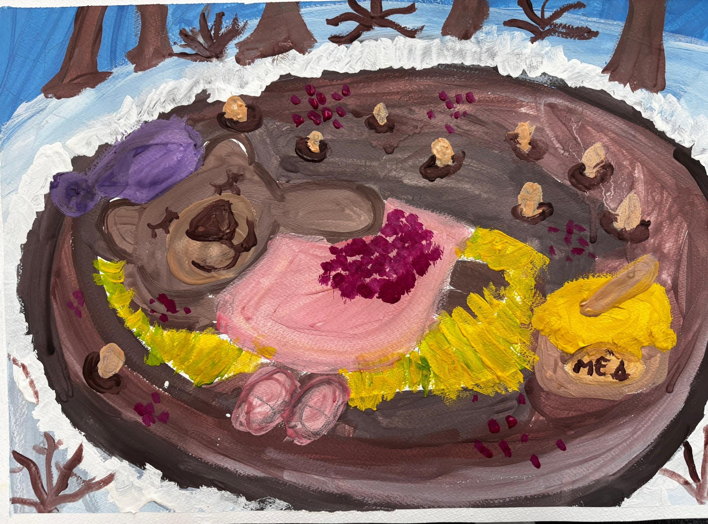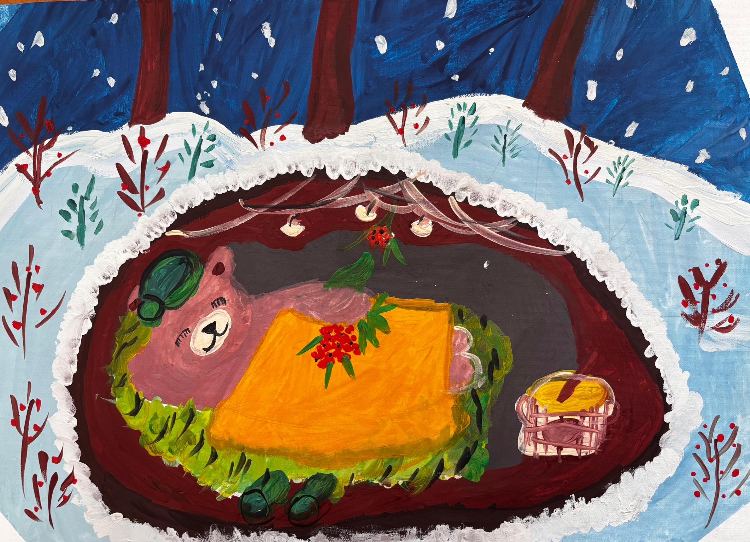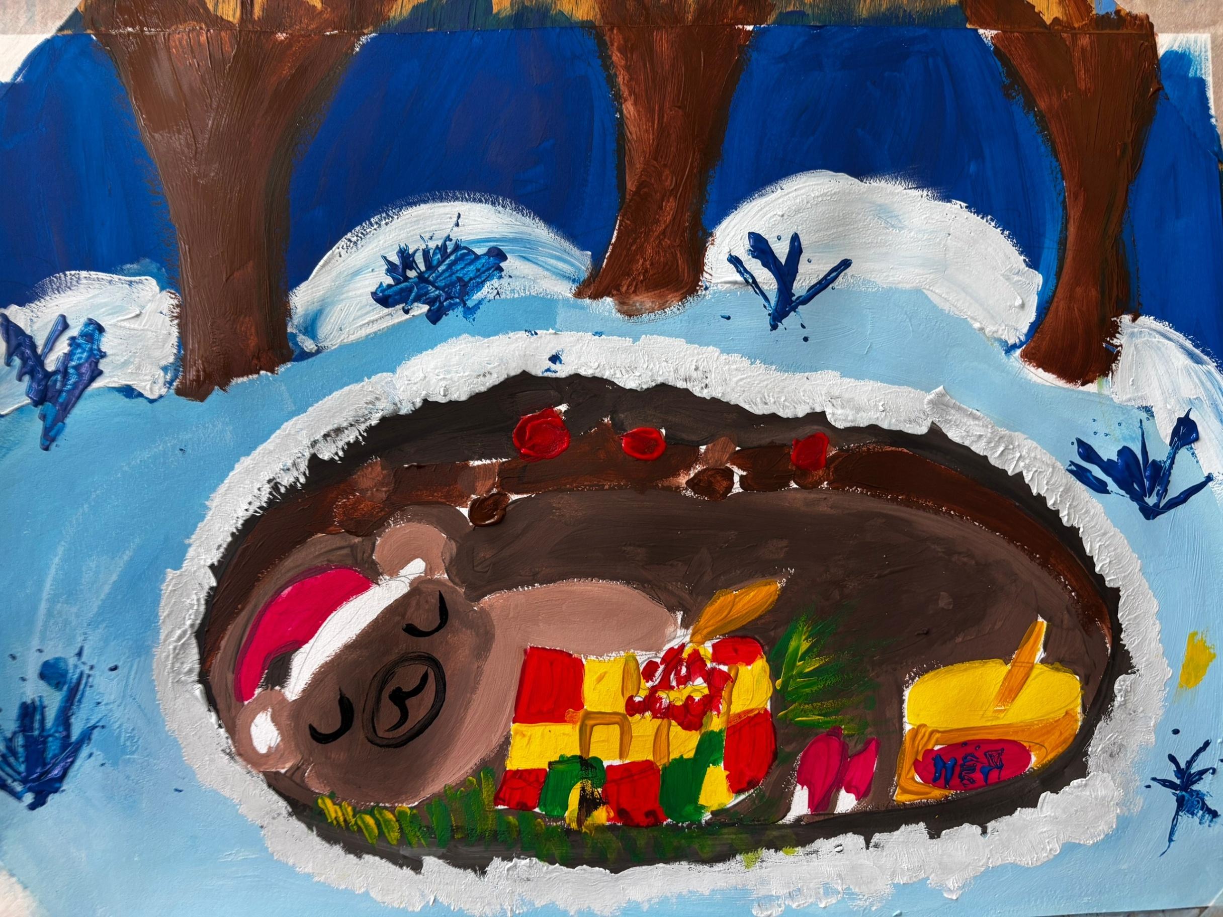 Рядом с каждым спящим мишкой — заветная бочка с медом, символ щедрости леса и предусмотрительности его обитателей. Эти бочки, полные солнечного золота, обещают сладкие сны и сытую зиму. Запасы, заботливо собранные, рассказывают о трудолюбии и мудрости лесных жителей, которые знают, как подготовиться к холодам. Каждая работа — это маленькая история, где гуашь превращается в пушистый мех, а кленовые листья — в уютные покрывала.