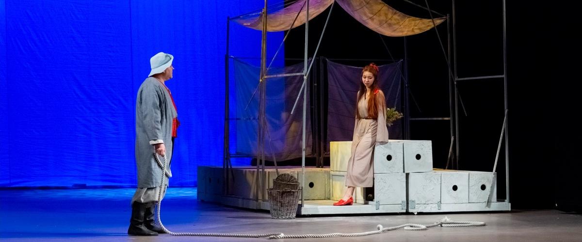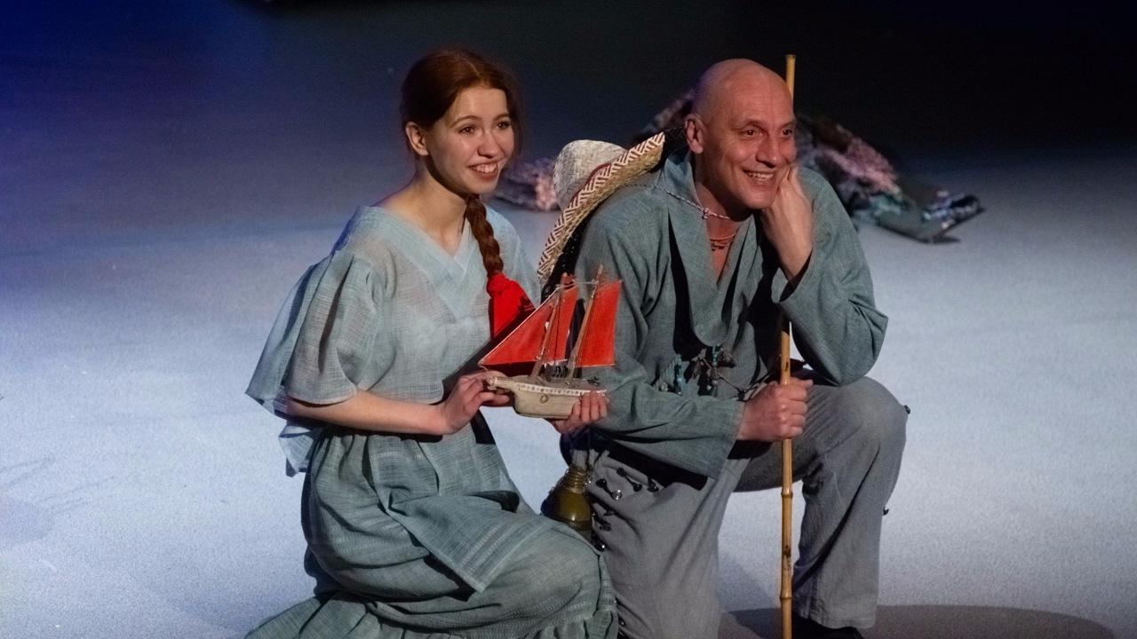 Спектакль «Алые паруса» – попытка рассказать словами Александра Грина о первом сильном чувстве, о любви, которая приходит не ко всем, а лишь только к тем, кто ее ждет, кто верит в сказку настолько, что не мешают ни бедность, ни бытовые неурядицы бедного рыбацкого поселка, ни жесткие нравы закаленных морем и тяжелым трудом людей. И обыкновенный кусок алой парусины становится символом свершившейся мечты, ожившей сказки, олицетворением романтических грез в юном сердце. Да – мир жесток и неприветлив, как взбешенное штормом море, как остов корабля, застрявший на мели и отданный на растерзание жизненным бурям. Но Ассоль... Она отчаянно ждет чуда, она не может даже мысленно отказаться от своих грез, она твердо верит, что однажды ее Грэй все-таки приплывет, чтобы изменить ее жизнь...