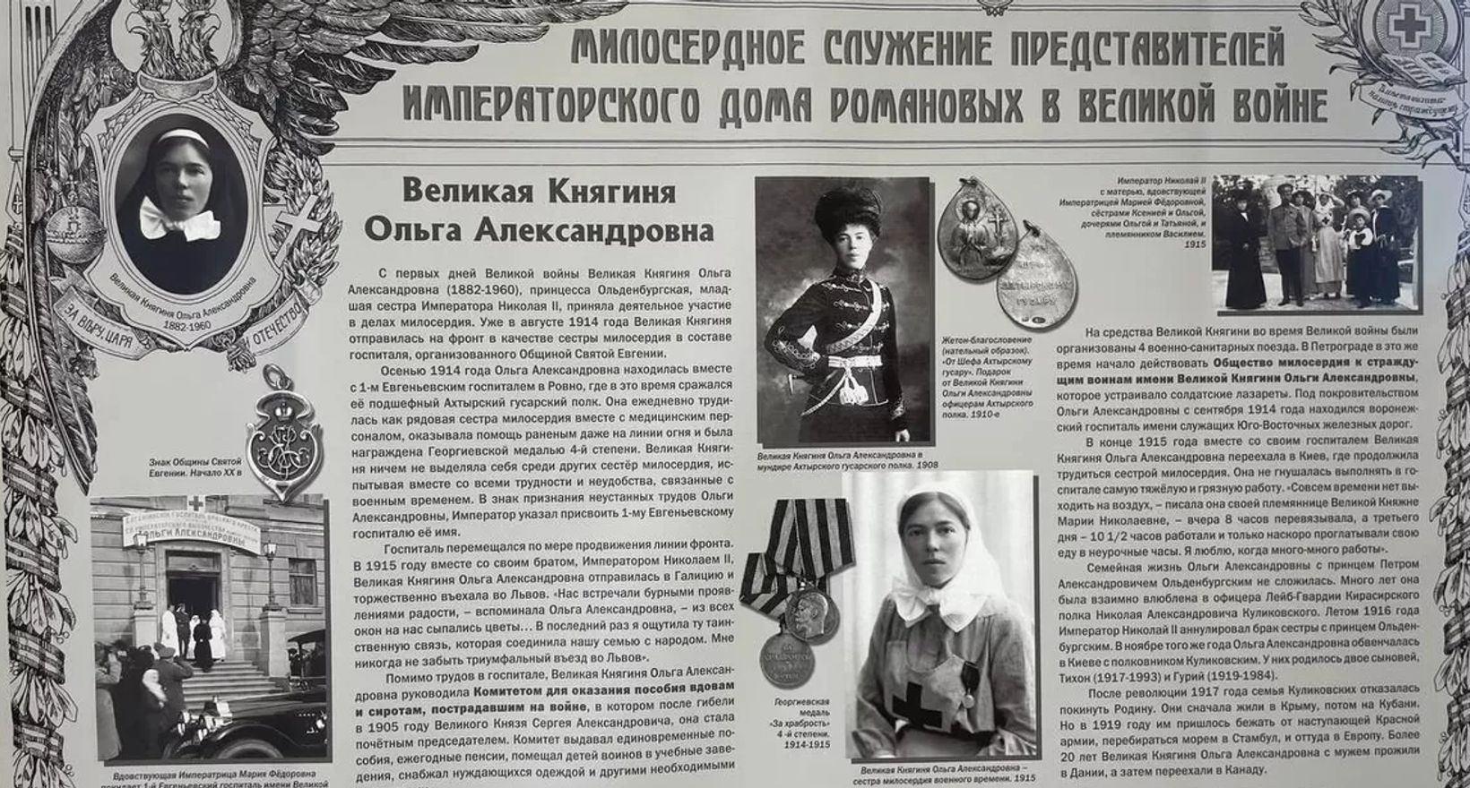 Передвижная стендовая экспозиция расскажет, как представители всех великокняжеских ветвей императорского дома Романовых во время войны оказывали помощь фронту и населению России. Эта форма благотворительной деятельности под покровительством императорского дома Романовых была очень популярна во второй половине XIX века.
