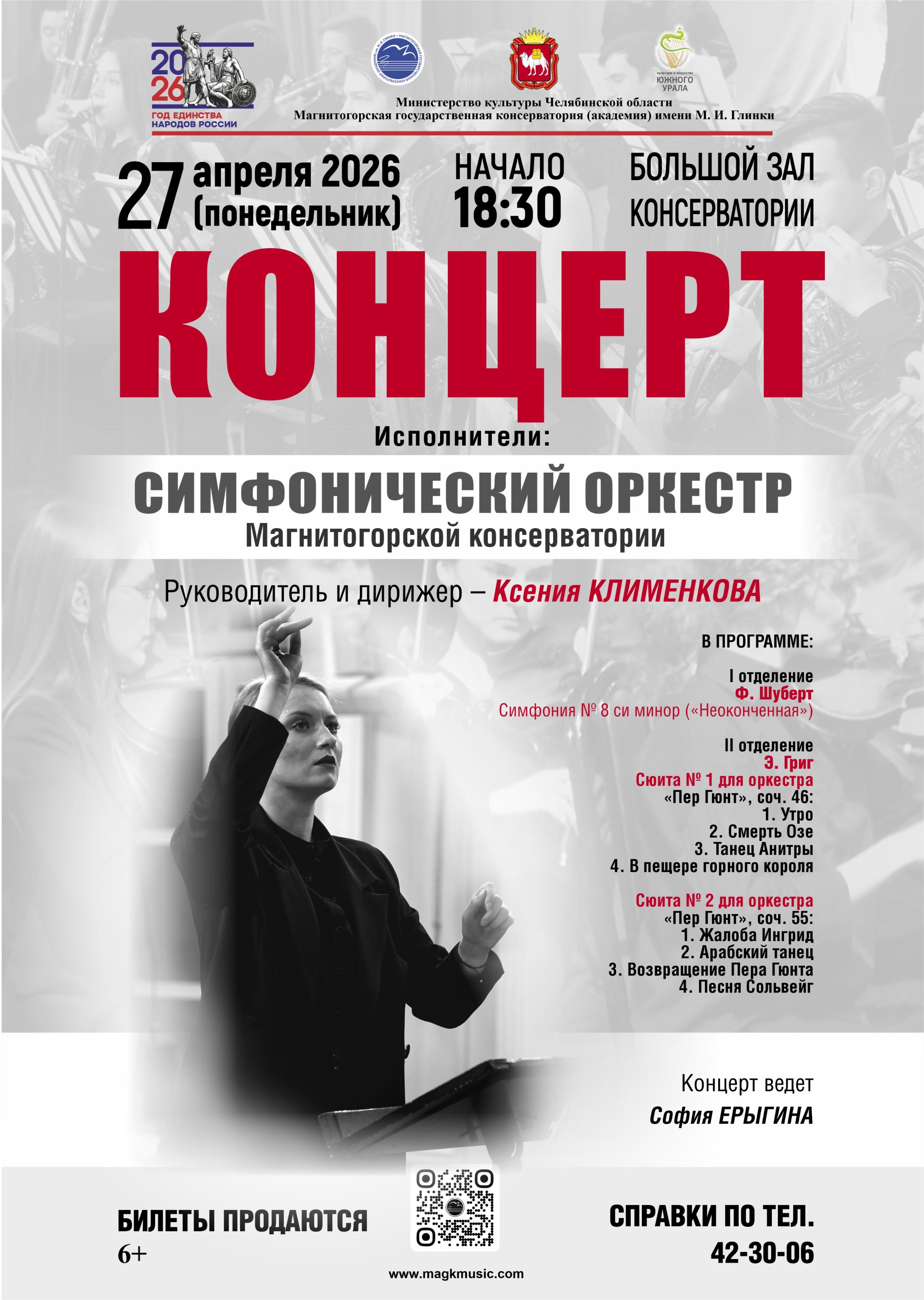 На сцене выступит симфонический оркестр Магнитогорской консерватории под руководством Ксении Клименковой. Это ее дебют в качестве дирижера-симфониста. Оркестр состоит из студентов колледжа искусства и культуры и Магнитогорской консерватории. В концерте прозвучит музыка эпохи романтизма. В двух отделениях концерта у слушателей будет возможность погрузиться в австрийскую и норвежскую музыку этой удивительной эпохи. В первом отделении прозвучит «Неоконченная» симфония одного из основоположников романтизма австрийского композитора Франца Шуберта. Во втором – прозвучит сюита «Пер Гюнт» норвежского композитора Эдварда Грига.