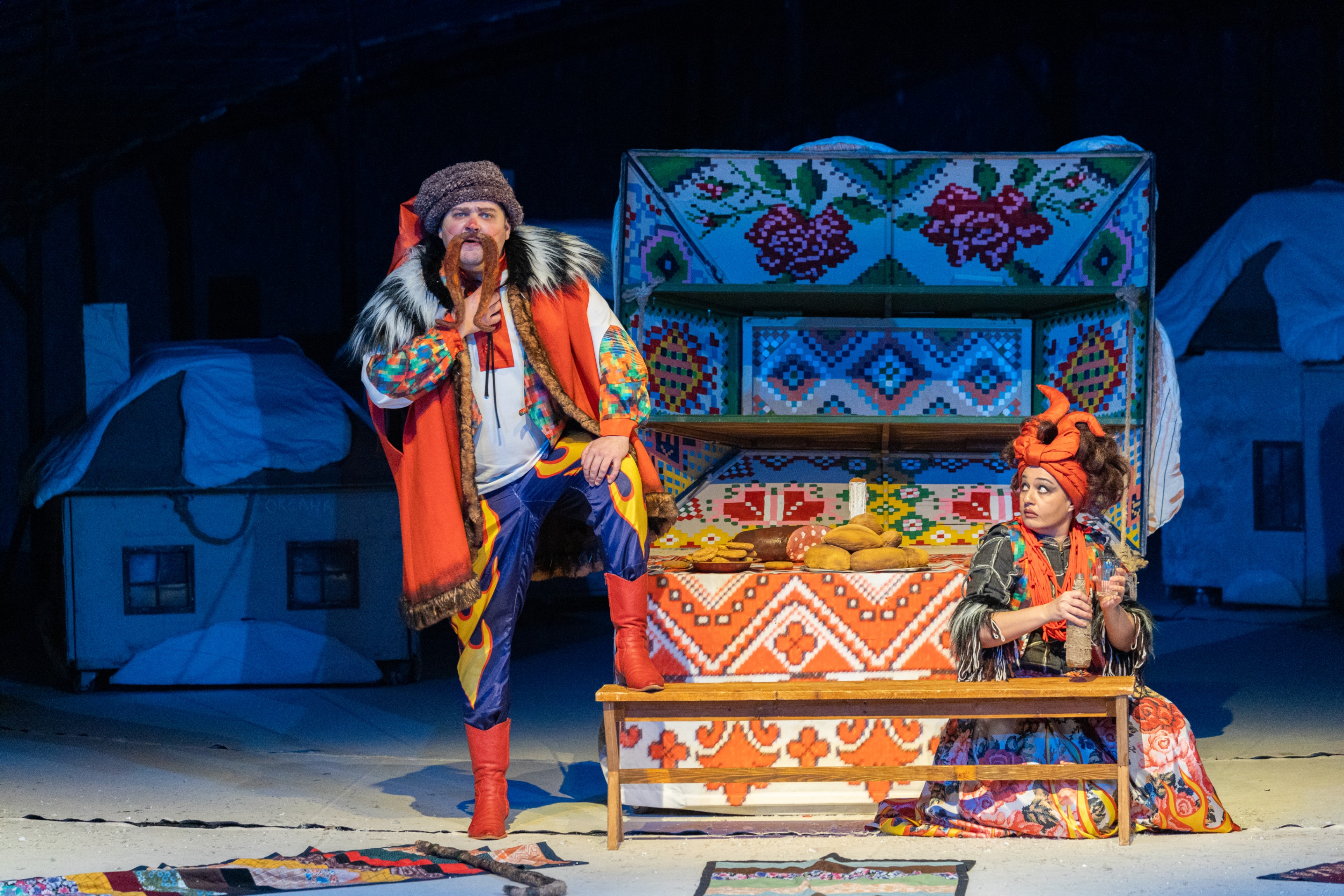 И пластическая, и звуковая палитры спектакля также внутренне контрастны: в них сталкиваются органичная, естественная литературная провинция (с ее удивительными песнями, танцами, обрядами) с новомодной столицей. Если в Диканьке Бог близко, как и родная земля, а отношения между людьми почти родственные, то в Петербурге все выглядит синтетическим, придуманным или надуманным, а потому и бездушным. Если задуматься, и у Гоголя в повести именно ведь Черт несет Вакулу в столицу, по его речам понятно, что он (Черт) там частенько бывает, а значит, бесовское это заколдованное место...