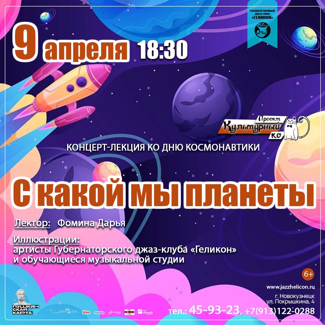 В честь праздника Дня космонавтики артисты джаз-клуба «Геликон» и обучающиеся музыкальной студии на творческой встрече исполнят самые известные из отечественных композиций о космосе и вспомнят историю их появления.