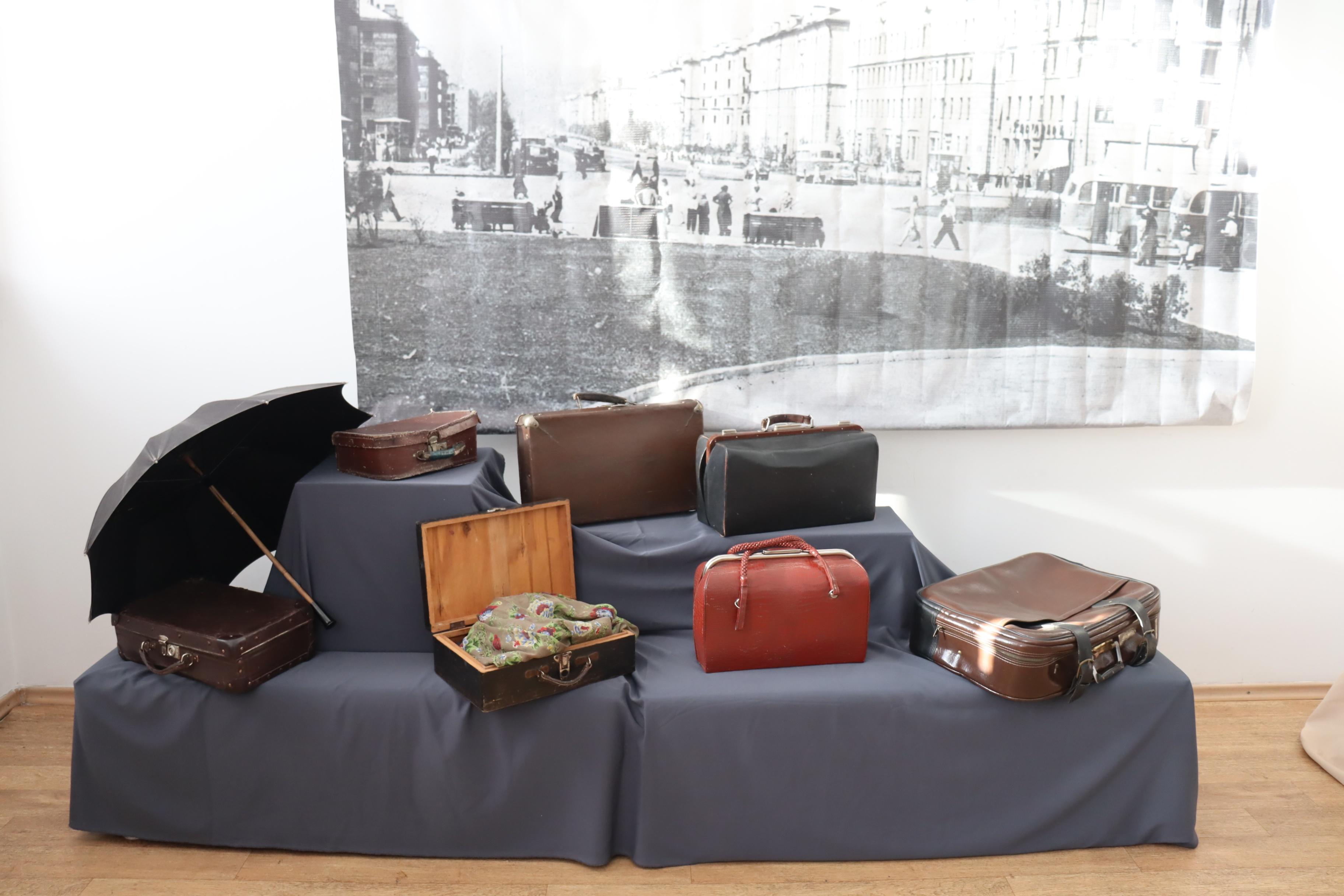 Самый старинный предмет – это кофр рубежа XIX–XX веков. Принадлежал он людям не бедным, в нем могло храниться и перевозиться приданое, нарядные платья, шали, лоскуты праздничных тканей. На выставке будут чемоданы из фанеры. Гости музея могли и не встречать подобных, а в 1930−1950-х с такими чемоданами кустарного производства приезжали молодые кузнецкстроевцы, энтузиасты-строители «города-сада». В 1960–1970-х, с развитием промышленности, в город прибывают квалифицированные специалисты: инженеры, архитекторы, и об этом поведают популярные в те годы чемоданы из фибры (прессованного картона) с металлическими уголками, обтянутые дерматином.