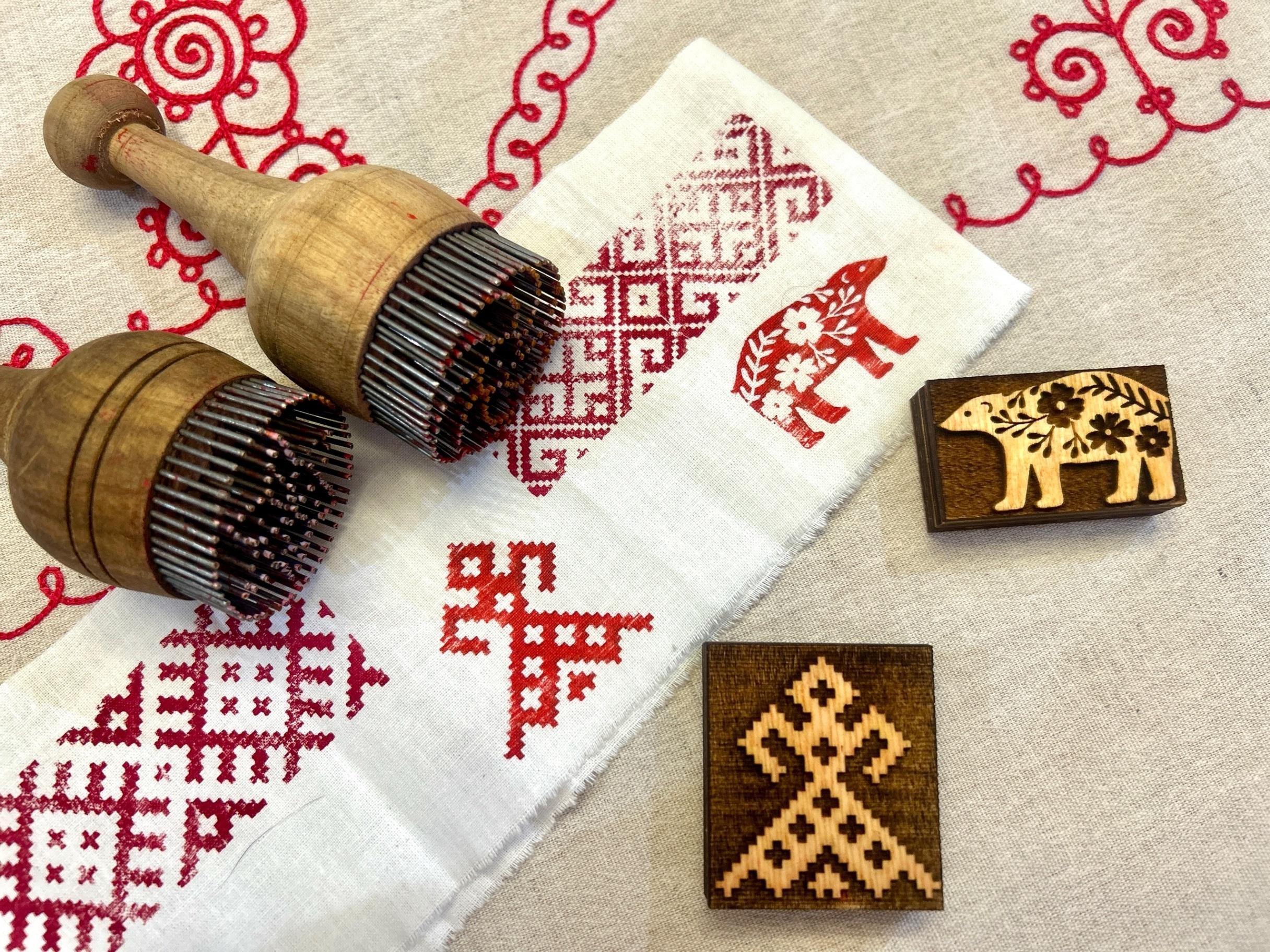 Традиция набойки в карельском стиле существует с давних времен. Верхняя набойка, или метод нанесения орнаментов на ткань с помощью штампов, стала частью текстильного искусства в этом регионе благодаря сочетанию практической необходимости и творческого самовыражения. Первоначально набивные узоры имели утилитарное значение: они использовались для украшения одежды, полотенец, постельного белья и других тканевых изделий.