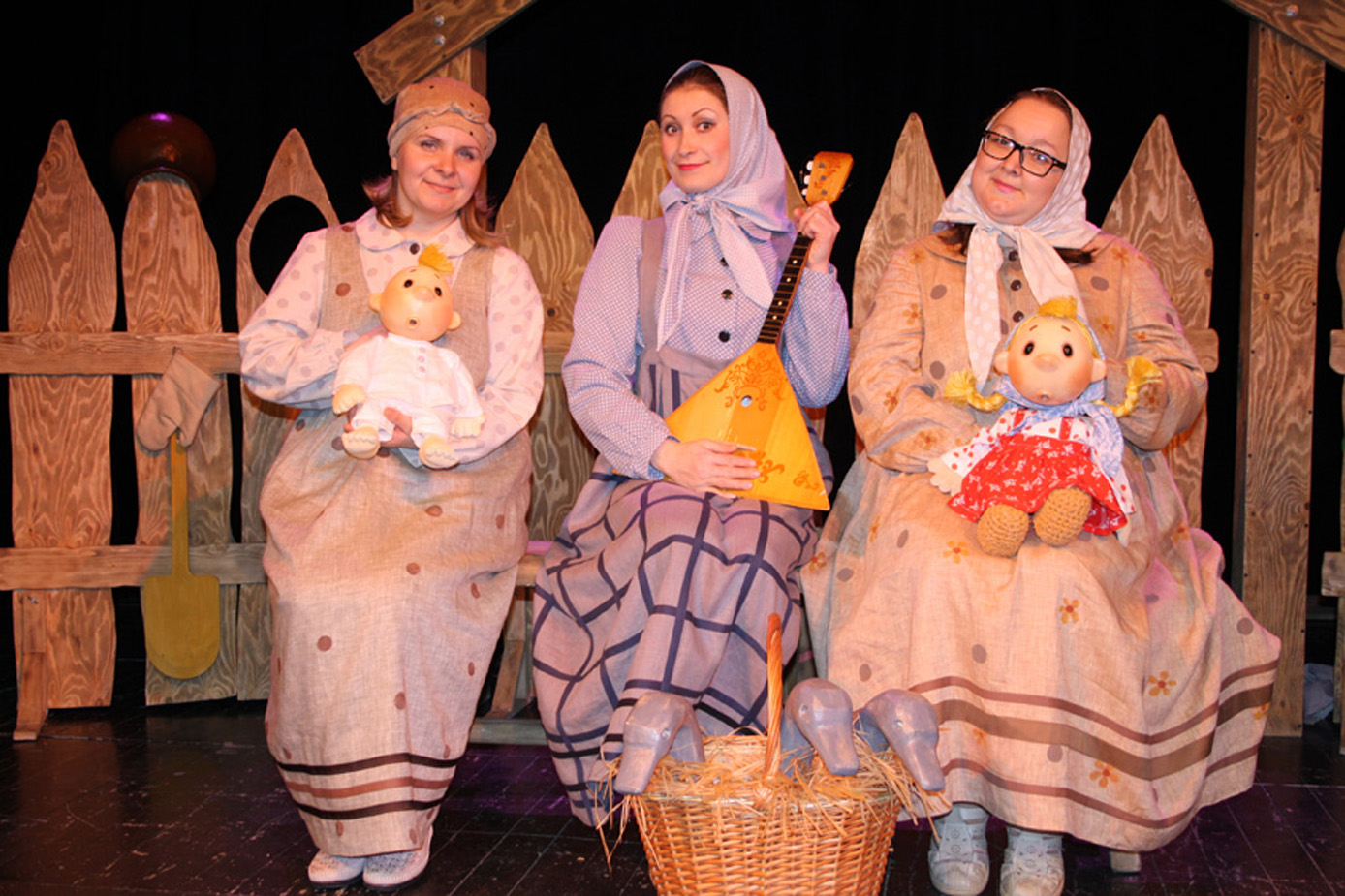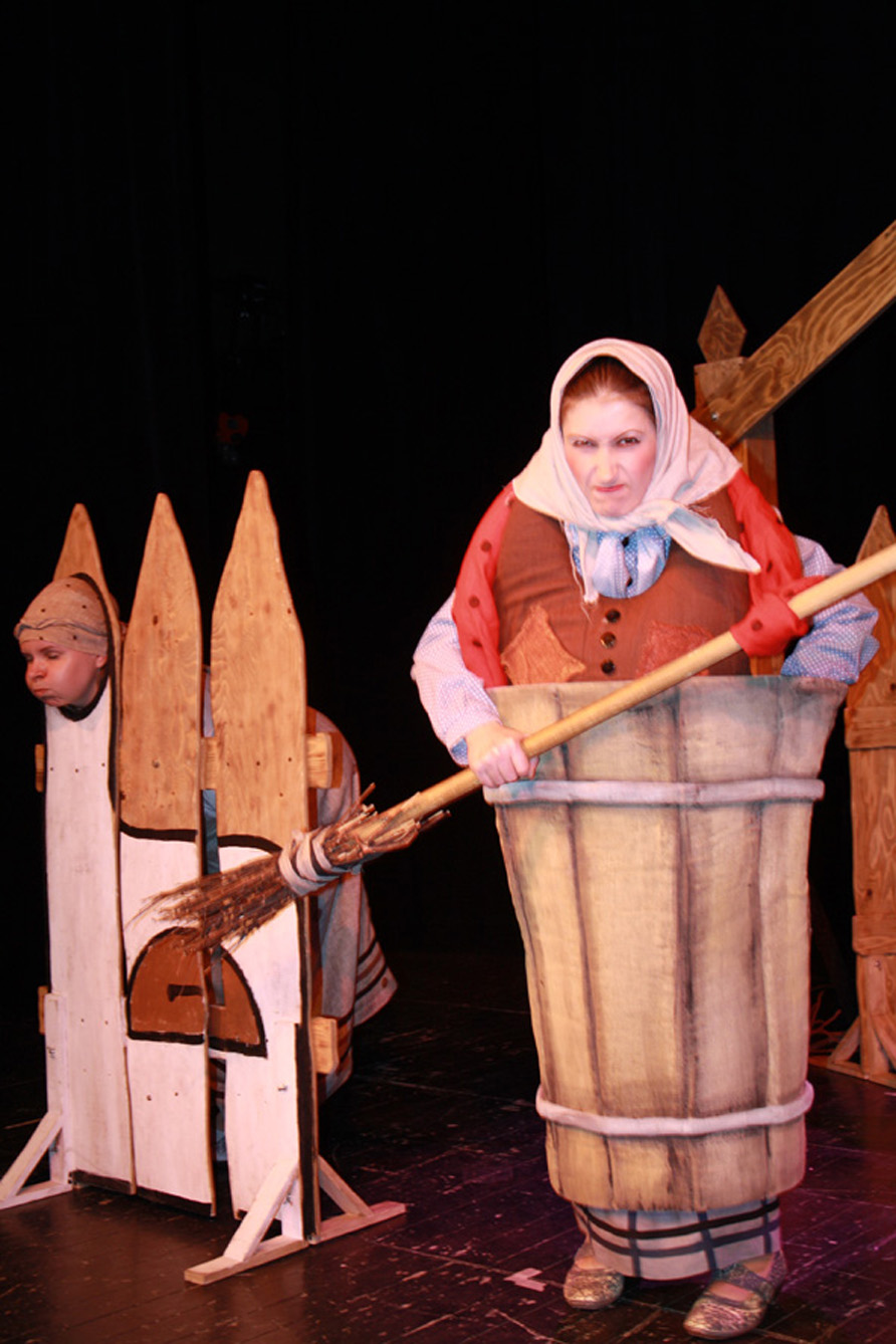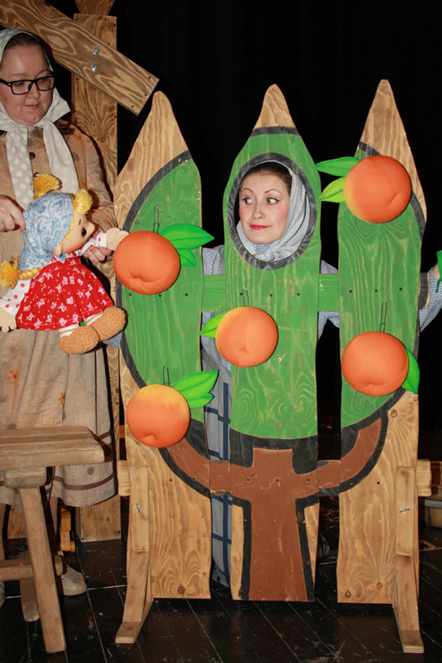 В спектакле режиссера Петра Васильева поучительную сказку «Гуси-лебеди» рассказывают три бабки на завалинке. И не только рассказывают, но и показывают с помощью подручных средств, перевоплощаясь то в Яблоньку, то в Печку и Речку, а то в саму Бабу-ягу!