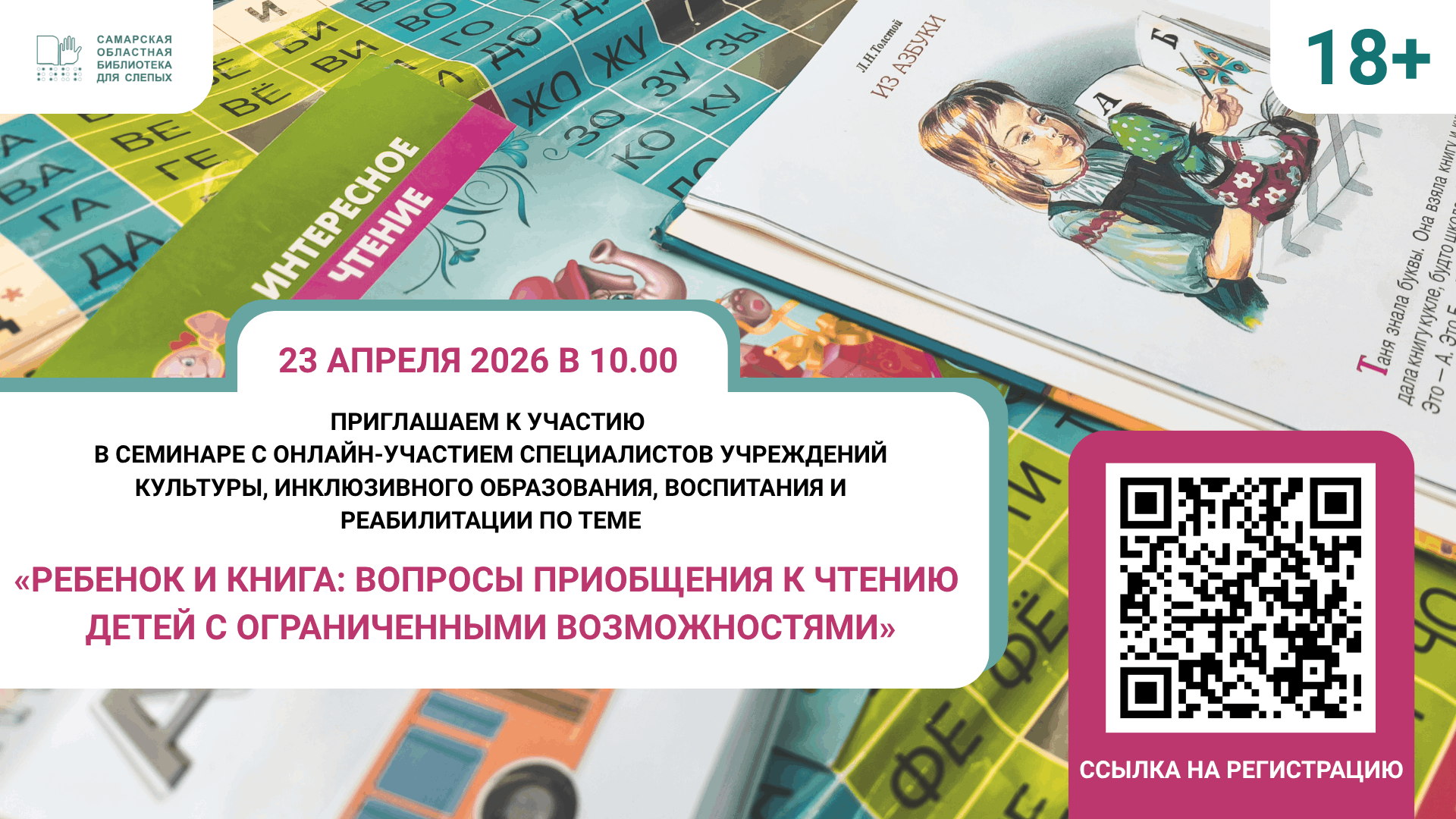 23 апреля 2026 в 10.00 (время самарское) Самарская областная библиотека для слепых организует семинар с онлайн-участием специалистов учреждений культуры, инклюзивного образования, воспитания и реабилитации по теме «Ребенок и книга: вопросы приобщения к чтению детей с ограниченными возможностями»