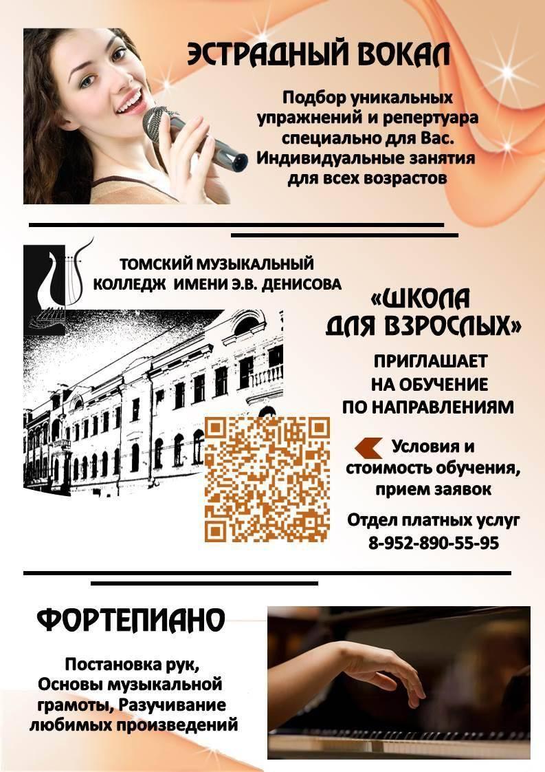 Отделение платных образовательных услуг «Школа для взрослых» Томского музыкального колледжа имени Э.В. Денисова предлагает всем желающим пройти обучение по направлениям: «Эстрадный вокал» и «Фортепиано».