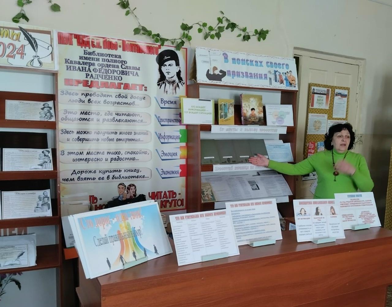 В культурно-досуговом центре сельского поселения Ново-Полтавское для школьников организован цикл мероприятий, посвященных профориентации. В рамках месячника абитуриента «Через библиотеку – к профессии» пройдут:
