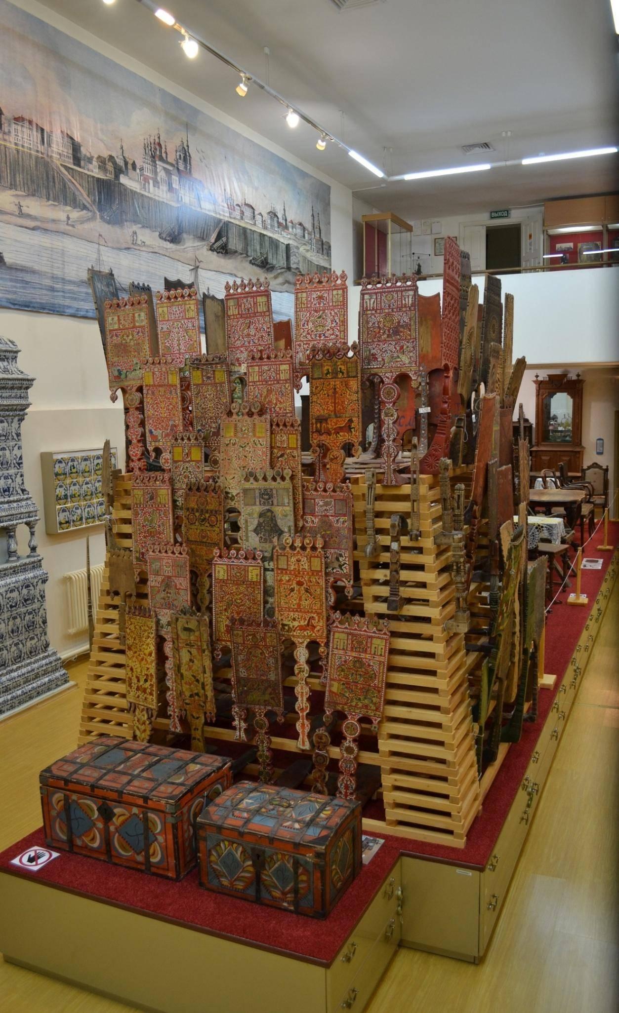 В депозитарии организовано открытое, то есть доступное для посетителей хранение предметов, что позволяет увидеть многочисленные музейные коллекции. В большом зале первого этажа представлены устюжские изразцы и зеркала изразцовых печей, собранные из подлинных предметов XVIII–XIX вв. В застекленных нишах воссозданы интерьеры жилых комнат XIX в. Дополняют представление о вкусах и предпочтениях устюжан стулья, диваны, буфеты, трюмо. На специально созданной для показа «горке» экспонируется коллекция прялок.