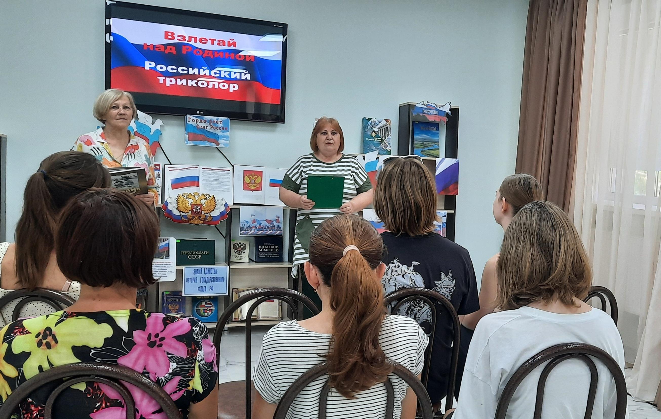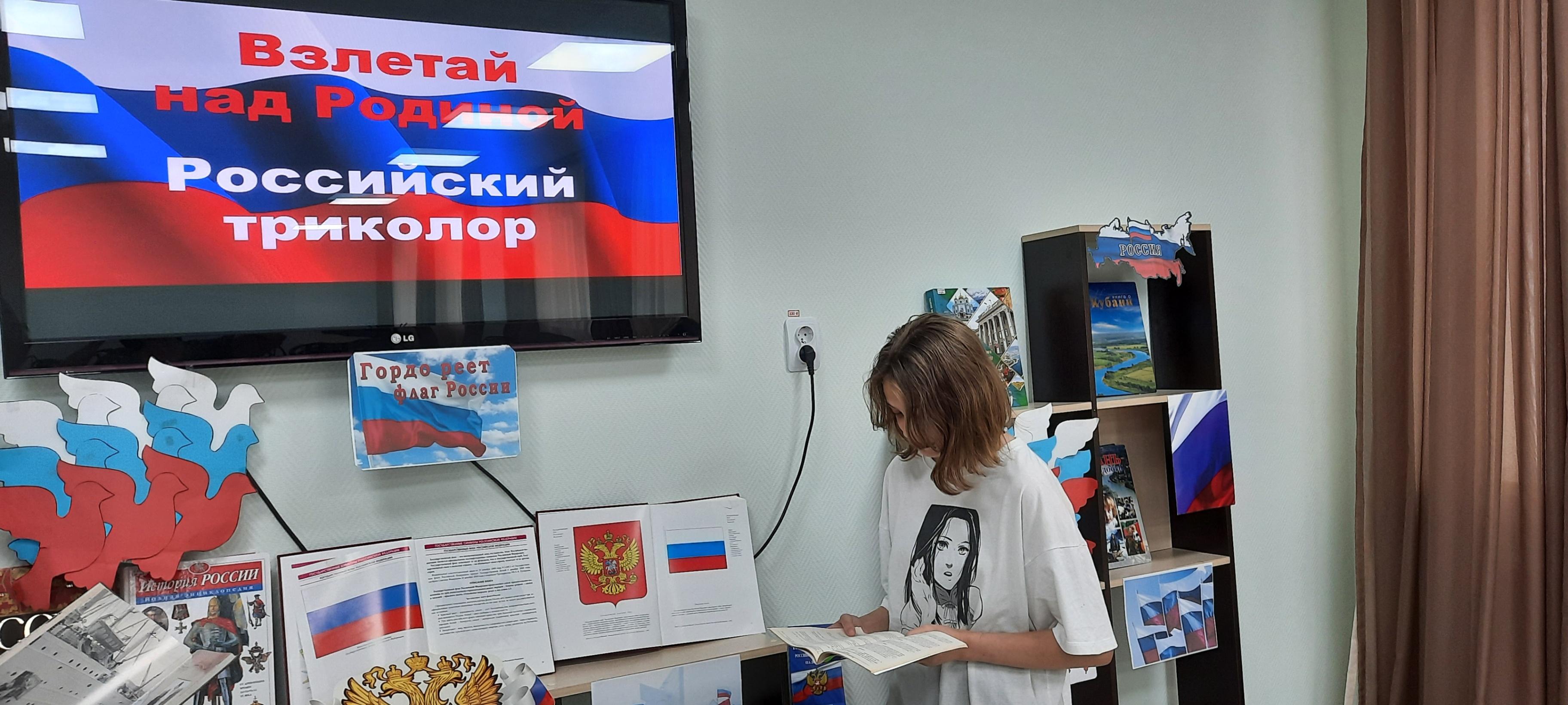 Участники мероприятия узнают об истории возникновения и утверждения флага, о том, что символизирует каждый цвет на флаге великой державы, что такое государственные символы, почему каждое государство имеет свой флаг и что он означает. Читатели примут участие в викторине «России флаг трехцветный», познакомятся с книгами на выставке «Флаг России – гордость страны», почитают стихи о флаге, о гербе. Каждый, присутствующий на мероприятии получит листовку «Флаг российский – гордость народа!» Патриотический час сопровождается электронной презентацией «Государственный флаг РФ – символ Великой державы»