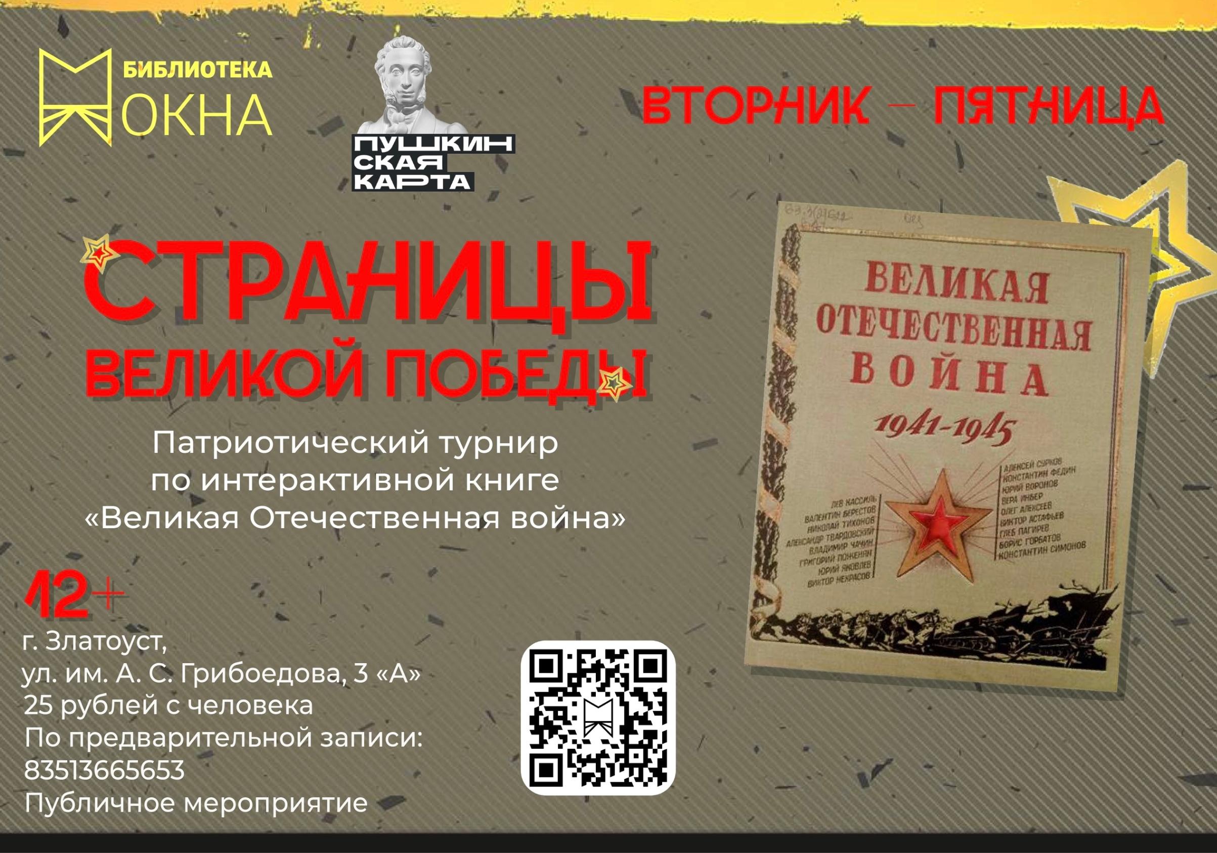 Страницы интерактивной книги «Великая Отечественная война. 1941–1945: рассказы, стихи, очерки, письма» станут важными ориентирами на пути изучения героического прошлого страны. Исторический фонд поможет уточнить и дополнить факты задания «По сводкам Софинформбюро». Интерактивные элементы, объемные конструкции позволят разобраться в обмундировании, знаках отличия. Вопросы, сопровождающие фотографии, плакаты и иллюстрации из книги, перенесут в атмосферу суровых военных лет, еще раз напомнят о подвигах героев военного времени. Знакомство с творчеством фронтовиков–писателей отправят участников к книжным полкам в поисках ответов. Стать участником турнира может команда из шести человек. Необходима предварительная связь по телефону 8(3513)66-56-56.