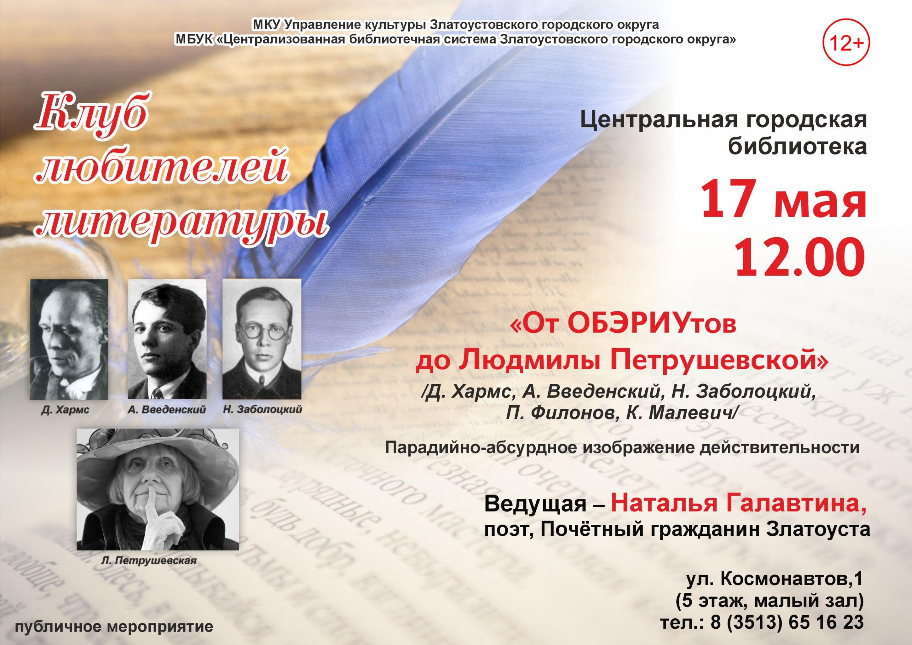 Наталья Анатольевна Галавтина и Центральная городская библиотека приглашают на очередное заседание литературного клуба. Наталья Галавтина – педагог, поэтесса, почетный гражданин Златоуста – предлагает поговорить об ОБЭРИУтах. Это поэты, писатели, сценаристы и другие деятели искусства, которые отказались от традиционных форм и методов. Они стремились создать «новое мироощущение» и «новое искусство», где слово и образ выходят за рамки привычного понимания. Как всегда, на заседании будут увлекательнейший рассказ Натальи Галавтиной, споры и живое общение.
