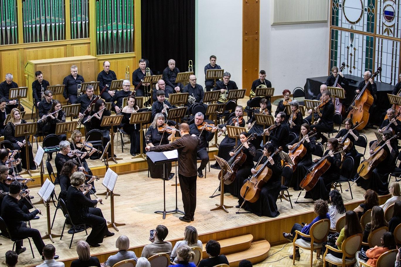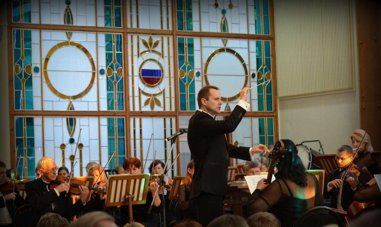 На сцене Кубанский симфонический оркестр и его дирижер заслуженный деятель искусств Краснодарского края Денис Ивенский.