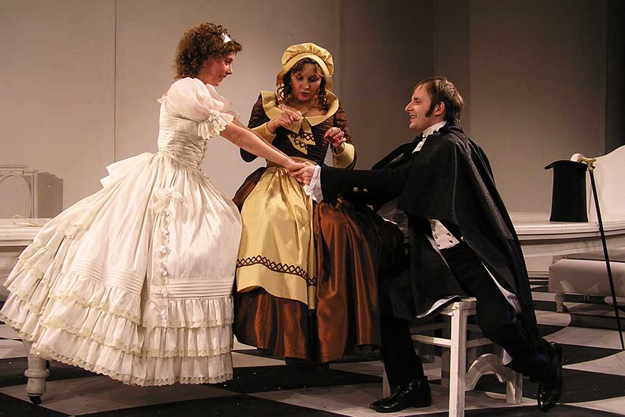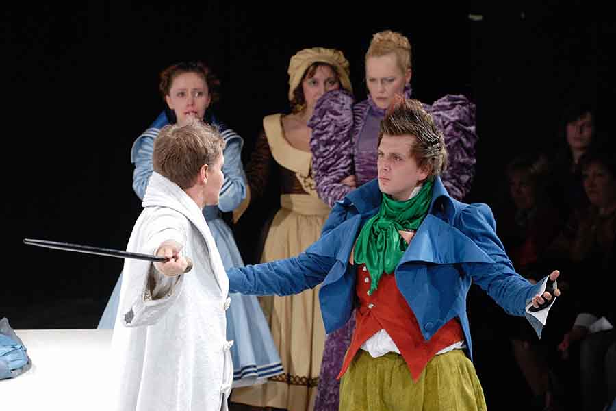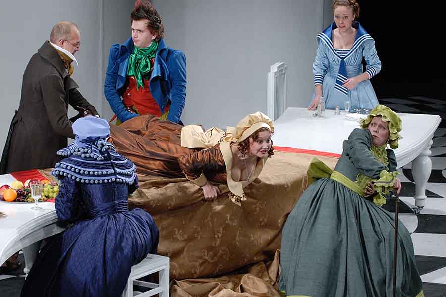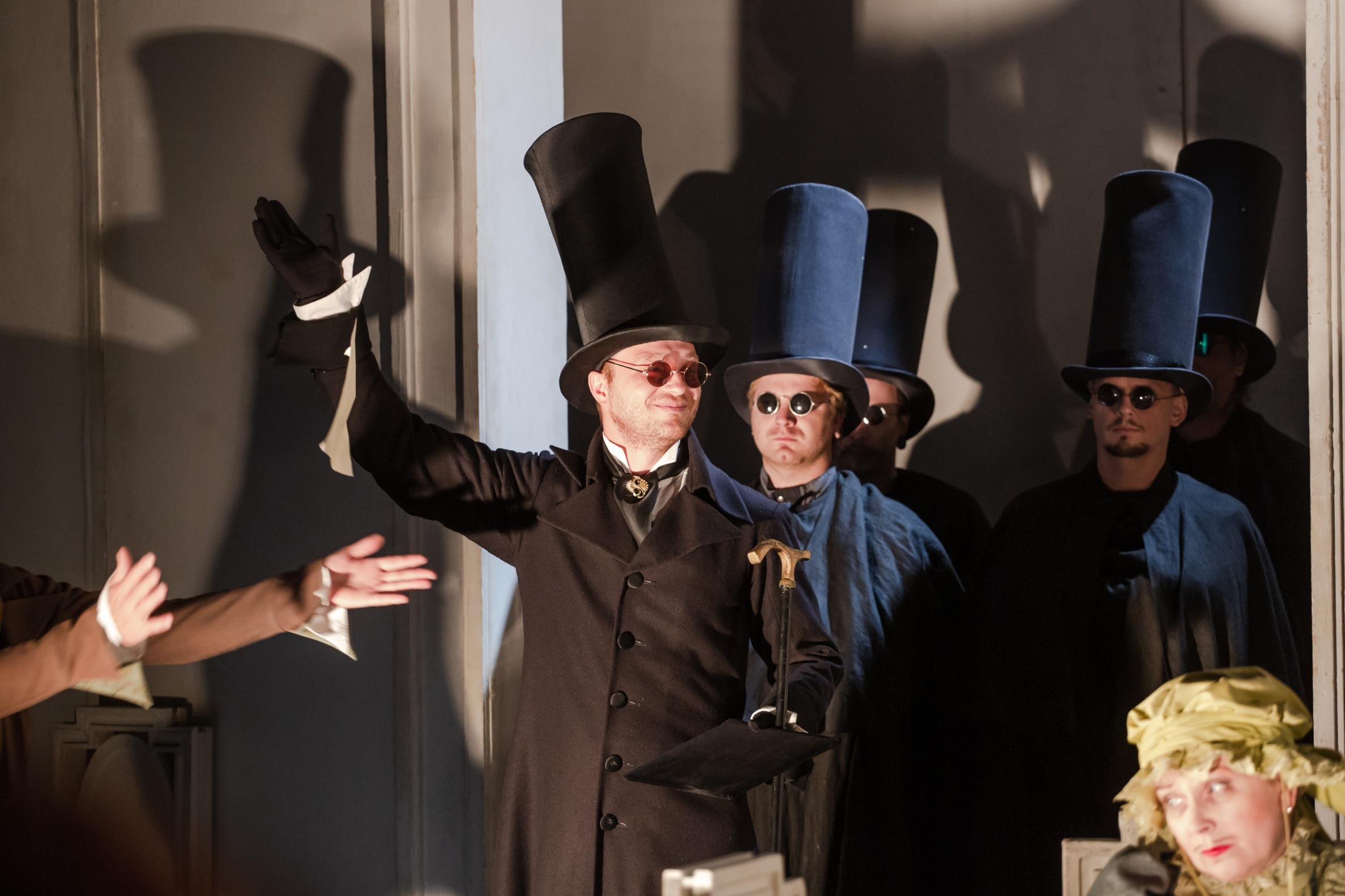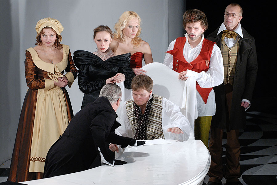 Известная пьеса Мольера привлекает театр уже не одно столетие. Но до сих пор человек задается вопросом: кто же такой Тартюф? Образец лицемерия и обмана, подлости и подхалимства? Мелкий плут, пройдоха? Или необычайно талантливый мошенник, сумевший «ослепить» своим обаянием уважаемого отца семейства? Грешник, прячущий истинное лицо под маской праведника? Или обманутый обманщик? Он – и то, и это. Он виртуоз манипуляции и азартный игрок, получающий удовольствия от своей рискованной игры. Сценическое пространство, решенное как шахматная доска, искаженная то ли силой зла, то ли человеческой глупостью, становится ареной комедийного сражения. Кто останется в выигрыше?! Мошенника разоблачат, глупость накажут, обиженные будут утешены, и вроде бы справедливость восторжествует.