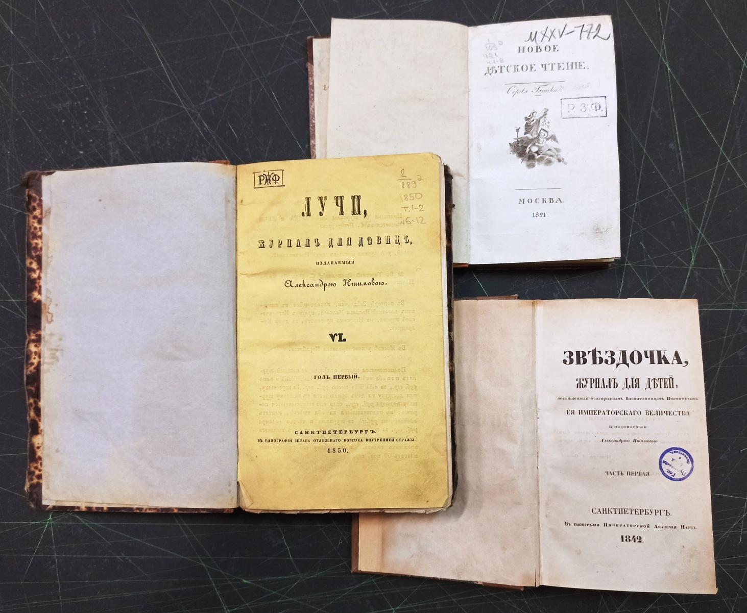 Также можно будет ознакомиться с детскими журналами XIX-XXI веков. Это «Новое детское чтение» (М., 1821) – журнал для детей, издававшийся Сергеем Глинкой в 1818-1824 годах, «Звездочка» (СПб., 1842) и «Лучи» (СПб., 1850) – первые журналы для девиц писательницы Александры Ишимовой.