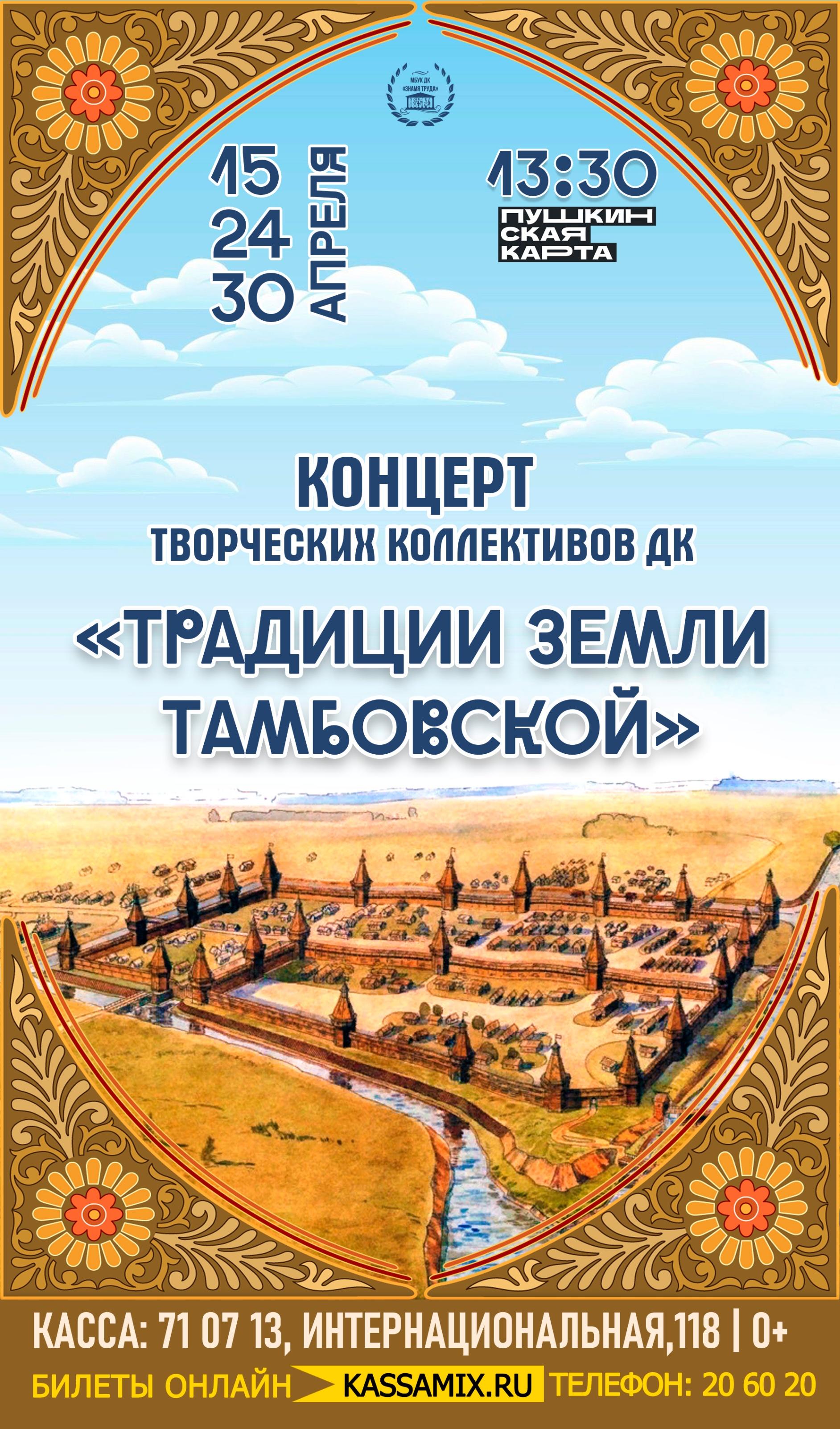 Четыре столетия назад, 27 апреля, на плодородных берегах Цны встал град Тамбов. Здесь, где переплетались судьбы разных народов – мордвы и мокши, татар и сарматов, – рождалась уникальная культура тамбовского края. В песнях и танцах местных жителей отразились все эти традиции, создав неповторимое народное искусство. В народных песнях и плясках, словно в драгоценном ларце, хранятся заветы предков, а каждый район области хранит свои неповторимые напевы и узоры.